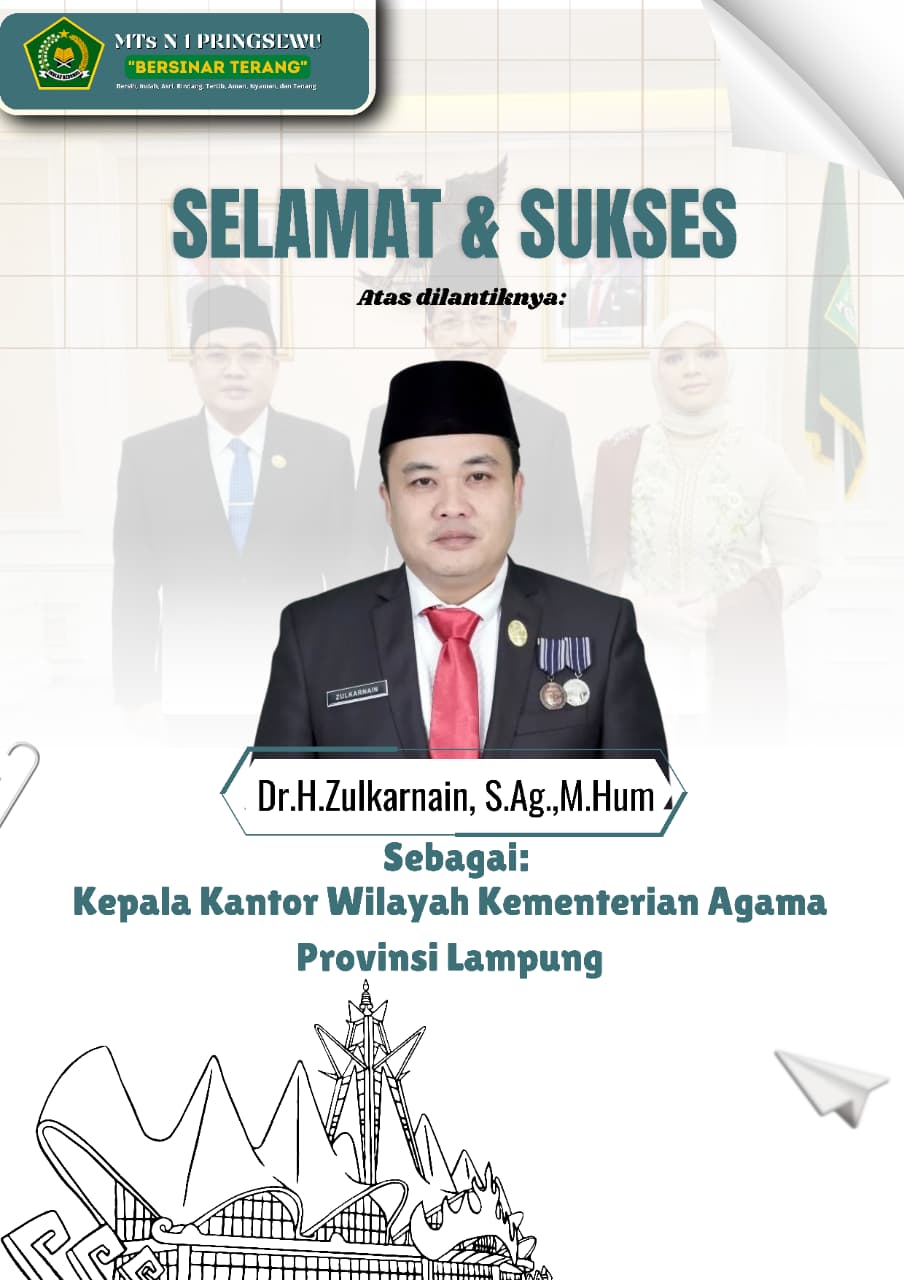 Keluarga besar Madrasah Tsanawiyah Negeri (MTsN) 1 Pringsewu mengucapkan Selamat dan Sukses atas pelantikan Dr. H. Zulkarnain, S.Ag., M.Hum. sebagai Kepala Kantor Wilayah Kementerian Agama Provinsi Lampung.